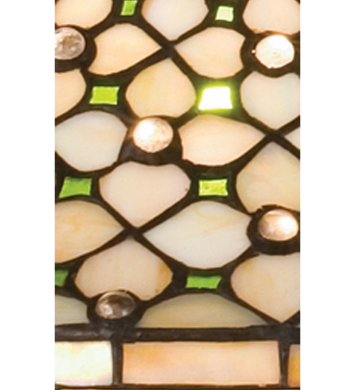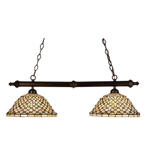 Diamond patterns of Beige Iridescent Glass and Ivy Green are accented all over with sparkling Clear Glass jewels droplets in this elegant Victorian style shade. The versatile stained glass shade is created using the famous Meyda Tiffany copperfoil construction. The two light island hardware is hand finished in a warm Mahogany Bronze. The Diamond & Jewel 2 Light Island Pendantt is featured in our American designed; handmade Stained Glass Lighting Collection. UL and cUL listed for dry and damp locations.