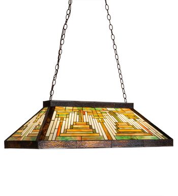 Like gazing out your window across the warm desert at sunset; interlocking tiles of Sand tone Beige glows behind the sun glistened Orange; Amber Green and Brown rays. All this is surrounded by a Root Brown border. The stunning oblong shade is created using the famous Meyda Tiffany copperfoil construction method and enhanced with a warm Craftsman Brown finish. The pendant is ideal for illuminating islands; billiard/dining tables; counters; bars and other spaces. The overall height ranges from 23 to 48.5 inches as the chain length can be easily adjusted in the field. Shade colors; metal finishes and fixture sizes can be customized to your needs. UL and cUL listed for dry and damp locations.