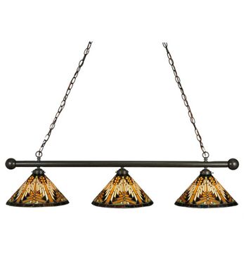 Warm earth toned Bone Beige and Moccasin Tan stained glass; accented with glistening Root Brown and Sage Green; is used to make this intricate interlocking patterned shade. A three light island in a hand applied Mahogany Bronze finish supports the handsome round cone shades inspired by historic American artwork. handcrafted with the copper foil technique developed by Louis Comfort Tiffany; this island is a true masterpiece.
