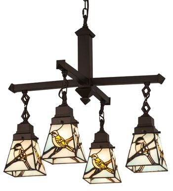 Bark Brown branches across a Azure sky make a pleasant repose for birds that visit our backyard during the early morning hours. This charming; original Meyda design is depicted on each of this chandelier's four art glass shades which are handcrafted utilizing our famous copperfoil construction process. The shades are complemented with hardware and a frame featured in a Mahogany Bronze. Dimmable energy-efficient lamping options such as LED; as well as custom sizes; styles and colors; are available. The chandelier is UL and cUL listed for damp and dry locations.