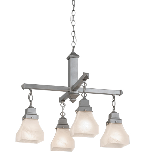 This stunning Bungalow styled ceiling fixture projects soft ambient light through four shapely Alabaster White art glass diffusers; which are complemented with handsome cross-bar hardware featured in a Nickel finish.This fixture can be used as a decorative luminaire in entryways; hallways and other rooms in residential and commercial settings.Custom colors; designs; sizes; and dimmable energy-efficient lamping options such as LED; are available. The chandelier is UL and cUL listed for damp and dry locations.