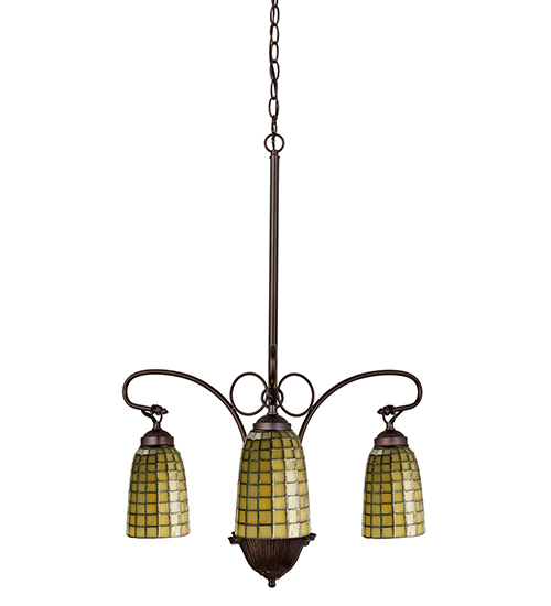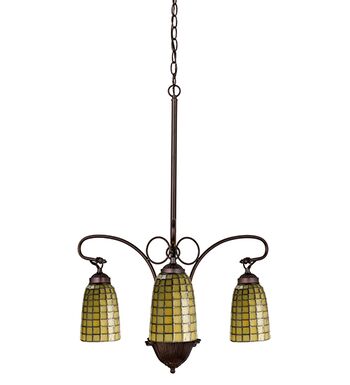 HONEYDEW-GREEN GLASS CASCADES IN A GEOMETRIC GRID ON ELONGATED TIFFANY STYLE HAND CRAFTED SHADES WHICH ARE SUSPENDED FROM GRACEFULLY CURVED ARMS IN THIS ELEGANT 3 LIGHT CHANDELIER.