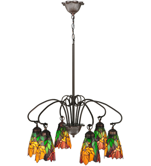 Stylized Coral and Burgundy Iris flowers with Spring Green leaves enhance six delicate stained art glass shades created with hand-cut glass and the famous Meyda Tiffany copperfoil construction technique. The shades are suspended from the gracefully curving Hand-forged Iron arms of a three-light chandelier; hand-finished in a warm Mahogany Bronze. The overall height ranges from 36 to 71.5 inches as the chain easily adjusts in the field for your specific lighting application. The Iris 3 Light Chandelier is included in our American-designed; handcrafted Stained Glass Lighting Collection. UL and cUL listed for dry and damp locations.