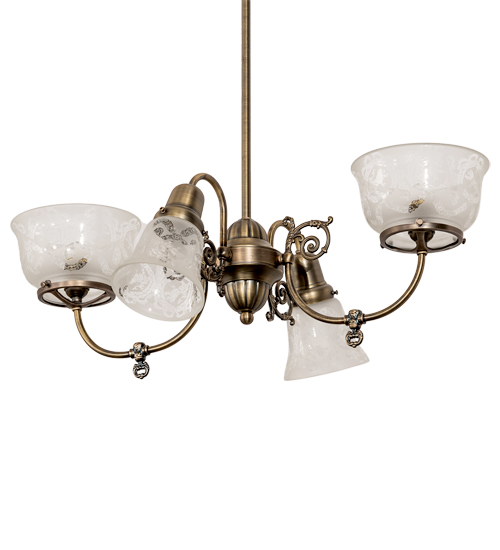 Inspired by lighting fixtures that were powered with both gas and electricity during a transitional period. Today this classic chandelier features four shades which reveal a lovely Wreath and Garland pattern in Frosted and Clear glass. Handcrafted of Solid Brass in our 180;000 square foot manufacturing facility in Yorkville; NY. Shade colors; metal finishes and fixture sizes can be customized. This fixture is UL and cUL listed for dry and damp locations.