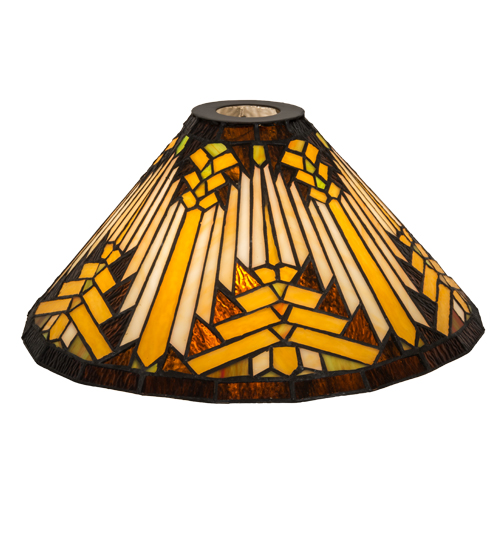 Like gazing out your window across the warm desert at sunset; interlocking tiles of Sand tone Beige glows behind the sun glistened Orange; Amber Green and Brown rays. All this is surrounded by a Root Brown border. The stunning shade is created using the famous Meyda Tiffany copperfoil construction method. The shade can be paired with a base to create a stunning table/floor lamp or with hardware to build a beautiful ceiling fixture.