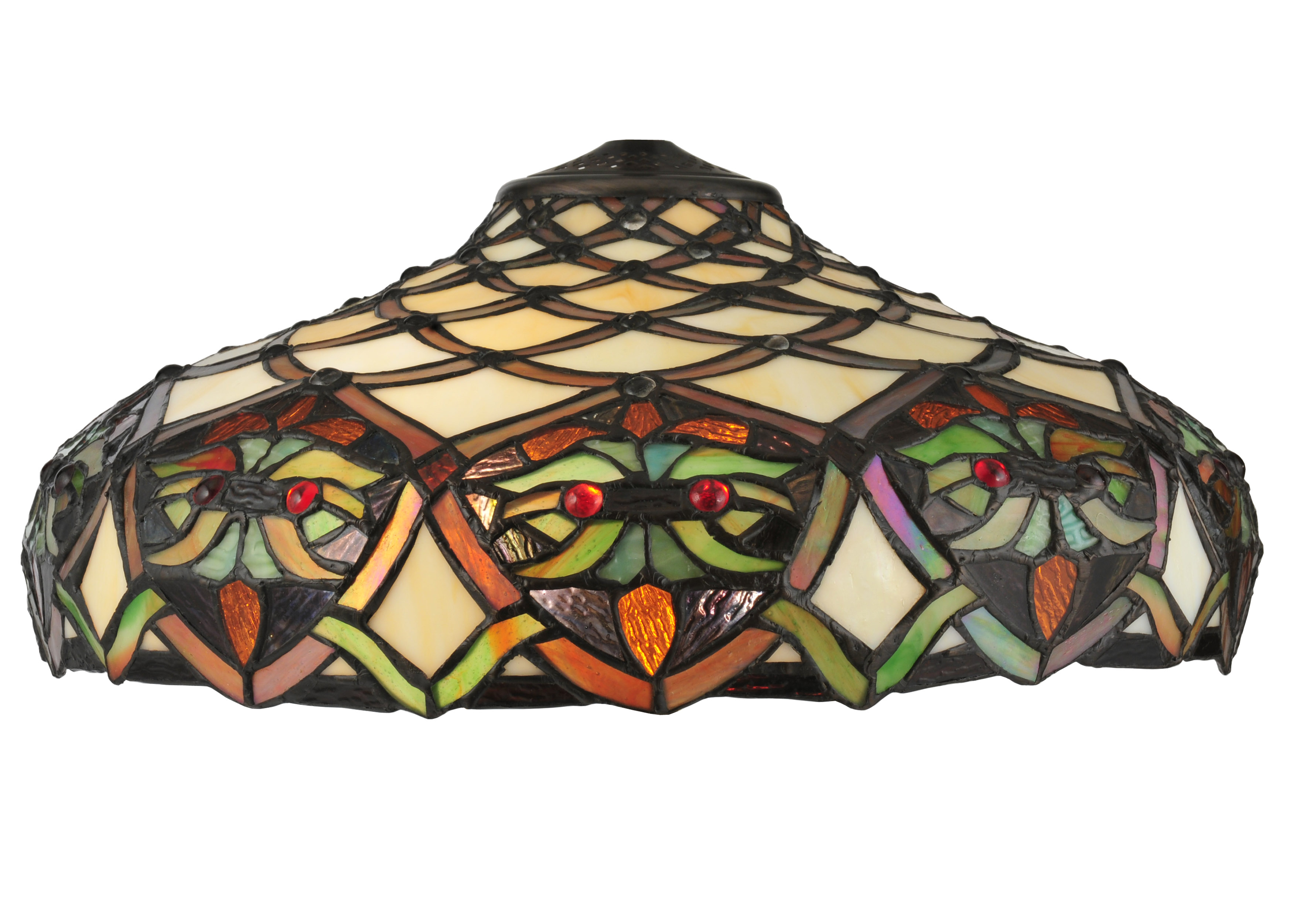 A luxurious Art Nouveau stained glass shade is highlighted with Sunburst jewels that accent Sunset Orange; Amber; Leafy Green; and Blue/Green patterns; with borders featuring swirled Blue/Green/Purple colored pieces of glass. The stained glass shade is handcrafted using Meyda Tiffany's world-famous copperfoil construction process. This magnificent Tiffany-styled art glass shade is inspired by antique lighting from West Hollywood; Florida; to West Hollywood; California. The shade can be used for illuminating tables; credenzas; and desks in homes; banks; and restaurants. The Franco Shade is included in our American-designed; handcrafted Tiffany Stained Glass Collection. Each shade is a unique work of art with color variations based on natural ingredients inherent in the glass.