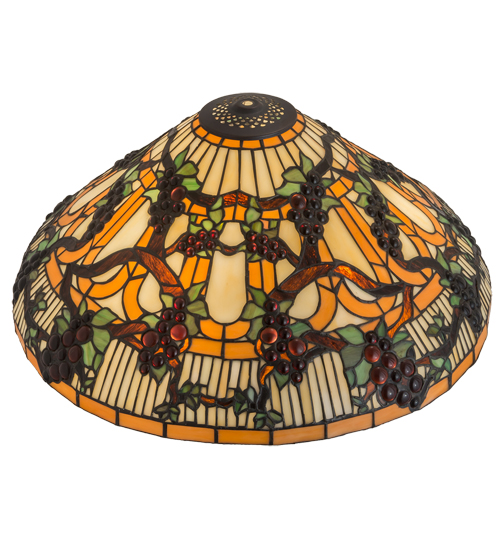 Bring sunny vineyards to your home or business with this lovely Meyda Original pendant. Radiant Concord Purple jewels; Vineyard Green leaves; and glistening dew-kissed Bark Brown vines wrap around the Golden Sunshine banded art glass shade with Red Jewels. The shade is created using the famous Meyda Tiffany copperfoil construction technique. The Jeweled Grape Shade is included in our American-designed; handcrafted Stained Glass Lighting Collection. Each shade is a unique work of art with color variations based on natural ingredients inherent in the glass. Please contact us if color matching is critical when ordering multiple items.