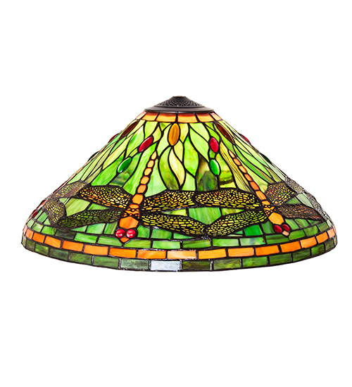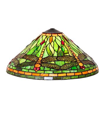 Inspired by Tiffany Studio's classic Dragonfly lighting masterpiece. Orange dragonflies with glowing Red glass jeweled eyes and metal filigree wings dive over a Green and Orange background with Orange and Green/Brown Bands. The shade is accented with Green; Red and Amber colored jewels. The art glass shade is created using the famous Meyda Tiffany copperfoil construction. Ideal for embracing a base to create a gorgeous table/floor lamp or hardware to build a Beautiful ceiling fixture. Each shade is a unique work of art with color variations based on natural ingredients inherent in the glass. Contact us if color matching is critical when ordering multiple items.