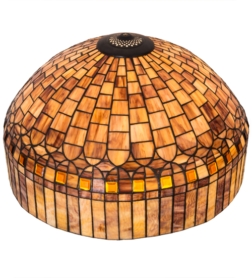 In the early 20th century; Tiffany Studios used artful mastery to develop the look of woven fabric with a fringed skirt out of glass. Meyda Tiffany is able to configure this timeless reproduction into a stunning shade. The striking shade features a dome brickwork design with fringe that reveals Multi-hued Autumn-like art glass including Amber; Brown; Beige and Mauve and enhanced with Amber glass jewels. The art glass shade is created using the famous Meyda Tiffany copperfoil construction process and can be used with a base to build a stunning table/floor lamp or hardware to make a beautiful ceiling fixture.