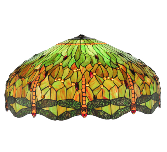 This beloved lighting design is modeled after the original hanging head dragonfly from Tiffany Studios. Diving Orange Dragonflies with glowing jeweled eyes and delicate metal filigree wings circle over hand-cut and copperfoiled pieces of Sunrise Yellow and Pond Green glass representing rippling water. This lovely shade is created using the famous Meyda Tiffany copperfoil construction and can be paired with a base to create a floor or table lamp. It can also be used to build a stunning ceiling fixture. The Tiffany Hanginghead Dragonfly Pendant is included in our American-designed; handcrafted Tiffany Reproduction Collection. Each shade is a unique work of art with color variations based on natural ingredients inherent in the glass.