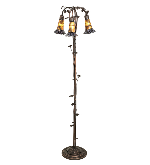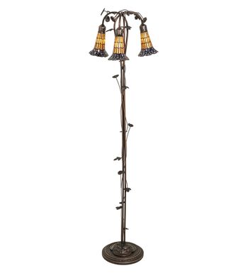 Inspired by the popular Tiffany design from the early 1900s... This floor lamp offers an attractive; delicate design featuring three stunning Honey and Pink art glass shades created with the famous Meyda Tiffany copperfoil construction technique. The Pond Lily shades are embraced by an elegant cast metal floor base with floral and vine accents that are finished by hand in Mahogany Bronze. The Pond Lily Floor Lamp is featured in our American designed; handcrafted Stained Glass Lighting Collection. UL and cUL listed for dry locations. Each shade is a unique work of art with color variations based on natural ingredients inherent in the glass. Contact us if color matching is critical when ordering multiple items.