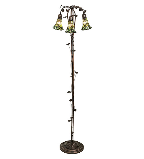 Inspired by the popular Tiffany design from the early 1900s... This floor lamp offers an attractive; delicate design featuring three stunning Green art glass shades that are created using the famous Meyda Tiffany copperfoil construction technique. The Pond Lily shades are embraced by an elegant cast metal floor base with floral and vine accents that are finished by hand in Mahogany Bronze. The Pond Lily Floor Lamp is featured in our American designed; handcrafted Stained Glass Lighting Collection. UL and cUL listed for dry locations. Each shade is a unique work of art with color variations based on natural ingredients inherent in the glass. Contact us if color matching is critical when ordering multiple items.