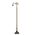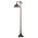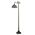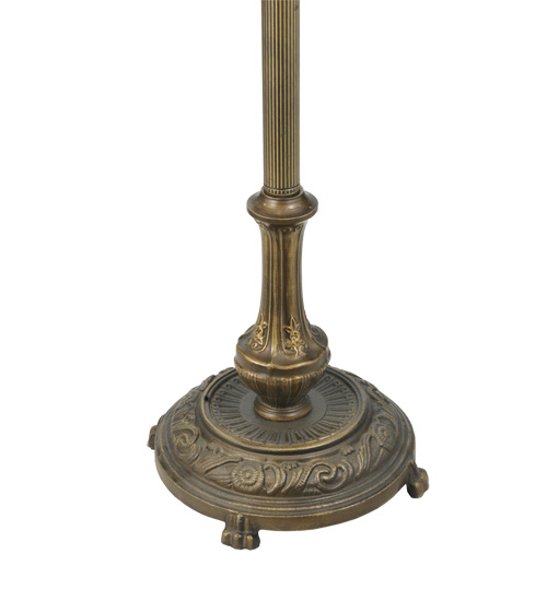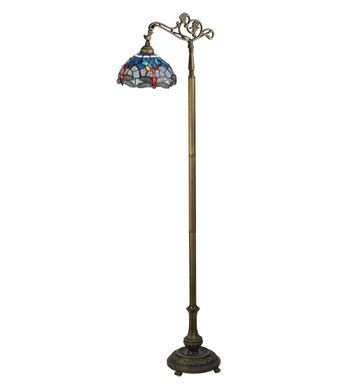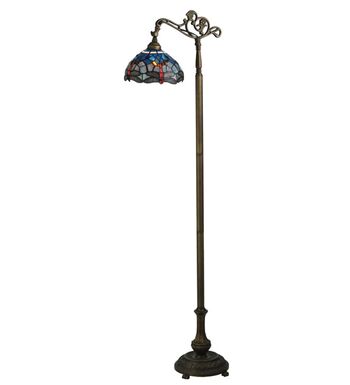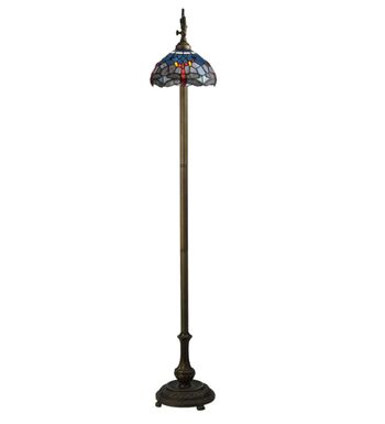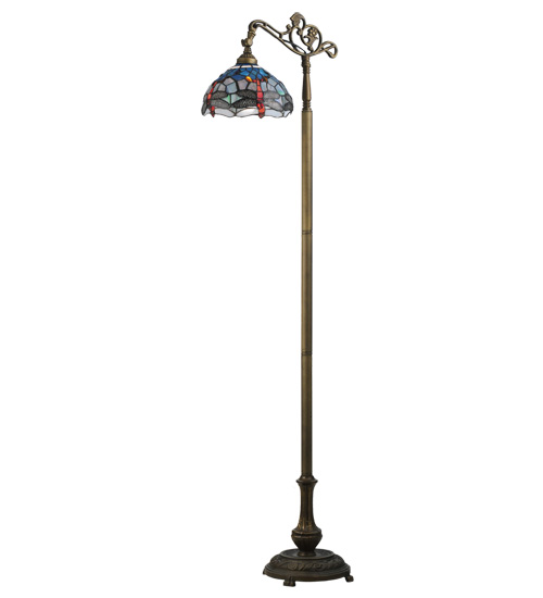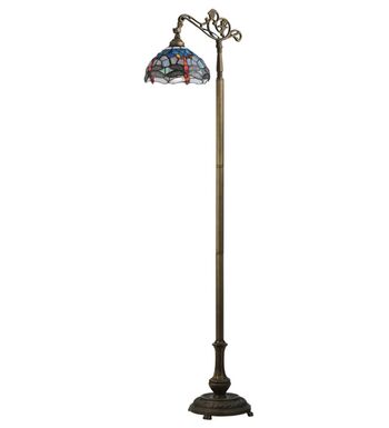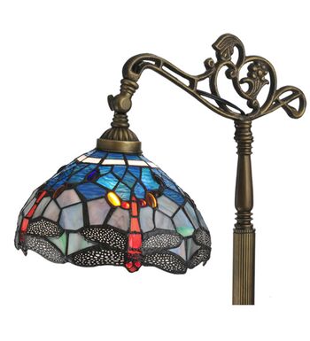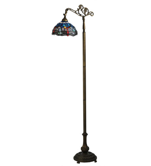 This version of Tiffany Studio's most beloved stained glass dragonfly design is modeled after the original hanging head dragonfly. Diving dragonflies with glowing Scarlet jeweled eyes and delicate metal filigree wings circle over hand cut and copper foiled pieces of Purple and Dusky Sky Blue-Violet art glass and accented with glistening jewels of Scarlet Red and Amber representing an early evening sky reflecting on rippling water. The stained glass shade is handcrafted using Louis Comfort Tiffany's world famous copperfoil construction process. The floor lamp bridge arm and base are finished in a warm hand applied Antique Brass. Ideal for ambient; accent and decorative lighting in fine homes; restaurants; hotels and retail and commercial use.