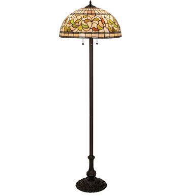 Subtle toned Autumn Gold; Russet and Moss Green leaves swirl against an Amber Mauve background in this Tiffany Studio stained glass reproduction. The shade is enhanced with bands of Purple; Blue and Green and created using the famous Meyda Tiffany copperfoil construction process. This elegant art glass lamp features a Mahogany Bronze finished floor base. Every Meyda Tiffany item is a unique handcrafted work of art. Natural variations in the glass colors make every item a masterpiece of its own. UL and cUL listed for dry locations.