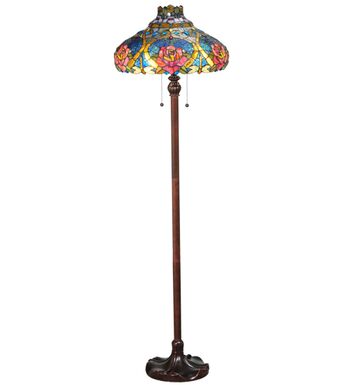 The Dragonfly re-creates Tiffany Studio's most beloved designs in all of its splendor. A Dragonfly flies and dives downward with glowing Golden jeweled eyes and delicate Yellow and Green glass wings that circle over hand-cut and copperfoiled pieces of Golden scrolls with Sky Blue; Clear and Red jeweled dew drops. Red Cabbage Roses are featured on a Blue and Green background which is topped with a crown of Lavender flowers.The art glass shade is created with Meyda Tiffany?s famous copperfoil construction process and complemented with a Mahogany Bronze finished base.