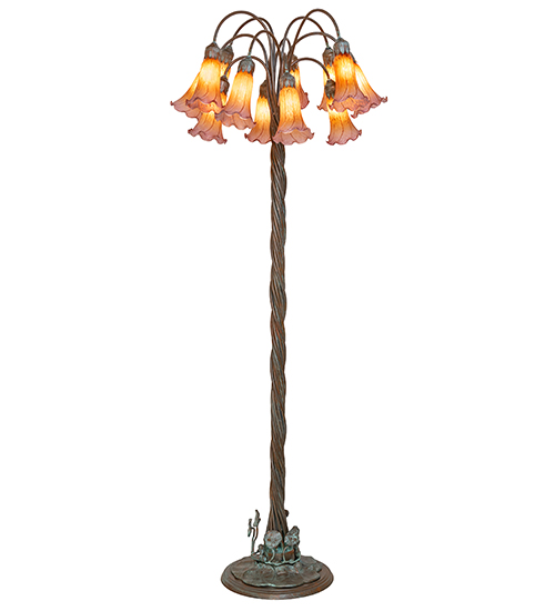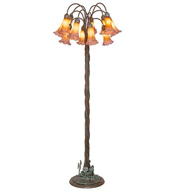 Recreating the popular Tiffany design from the early 1900s... This floor lamp offers an attractive; delicate design featuring 12 stunning shades created with Amber and Blue Favrile-style mouth-blown art glass. The Pond Lily shades are embraced by an elegant Cast Bronze Base with floral and vine accents featuring a rich Mahogany patina.