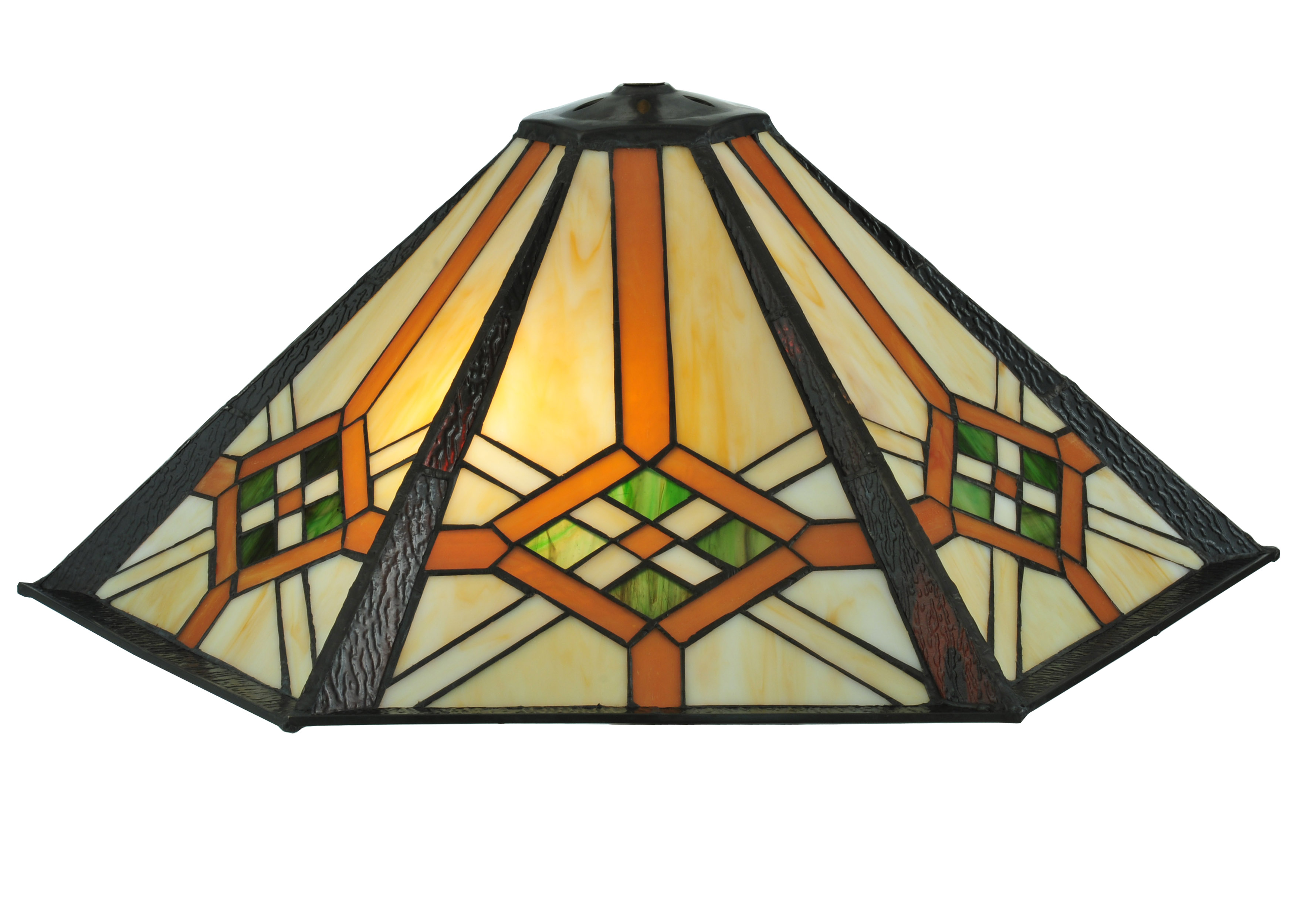 This lamp shade; inspired by the clean geometric lines of the mission style; has diamonds and raised bands of Root Beer granite glass on panels of Bone Beige and Moss Green. Hand cut pieces of glass are wrapped in copperfoil and soldered together in the Tiffany tradition to make this handsome shade. The hexagonal shaped shade is supported by a 2 light mission styled; footed floor base; hand finished in Dark Bronze. "
