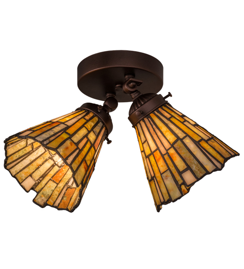 This unique decorative flushmount enables easy adjustment of the two shades to direct light where needed for a variety of applications. Thinly carved and polished natural Jadestone in earthy tones of Moss Green; Tan and Ivory become luminescent in these charming shades. Over the years people have enjoyed Jade which represents good luck; wisdom and the power to heal and protect. The stone shades are crafted with the famous Meyda Tiffany copperfoil process that is used on stained glass shades. Mahogany Bronze finished hardware completes this precious fixture.