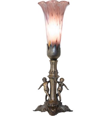 Recreating the famous Tiffany design from the early 1900s. This accent lamp features a stunning shade that is mouth blown of Purple Iridescent; Favrile-styled art glass. The Pond Lily shade is embraced by an elegant Twin Maidens figurine cast metal base finished by hand in Antique Brass. This Tiffany Reproduction lamp is perfect for homes and restaurants from Corona; Queens and Laurel Hollow; Long Island; New York; to Winter Park; Florida; to Chicago; Illinois. The Tiffany Pond Lily Maidens Mini Lamp is included in our American-designed; handcrafted Favrile Glass Collection. UL and cUL listed for dry locations. Each shade is a unique work of art with color variations based on natural ingredients inherent in the glass.