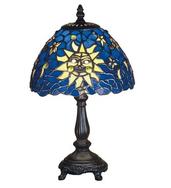 In a Celestial Blue glass sky; a Solar Yellow sun watches over the moon and the stars. Sparkling Citrine like jewels accent the hand crafted copper foiled stained glass shade. This charming Meyda Tiffany original mini lamp is hand finished in Mahogany Bronze.