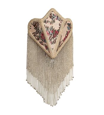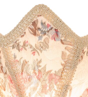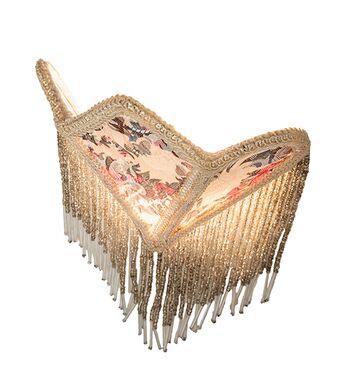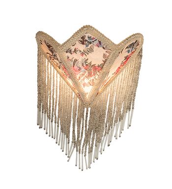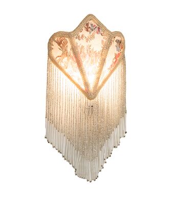 Soft Ivory damask-styled fabric edged in long strands of Glass Beaded Fringe is draped across a gracefully curving form. This night light is highlighted with an elegant Victorian-inspired Textrene shade with a Floral Ivory colored design. The Fabric & Fringe Floral Night Light is included in our American-designed; handcrafted Fabric & Fringe Collection. UL and cUL listed for dry locations.