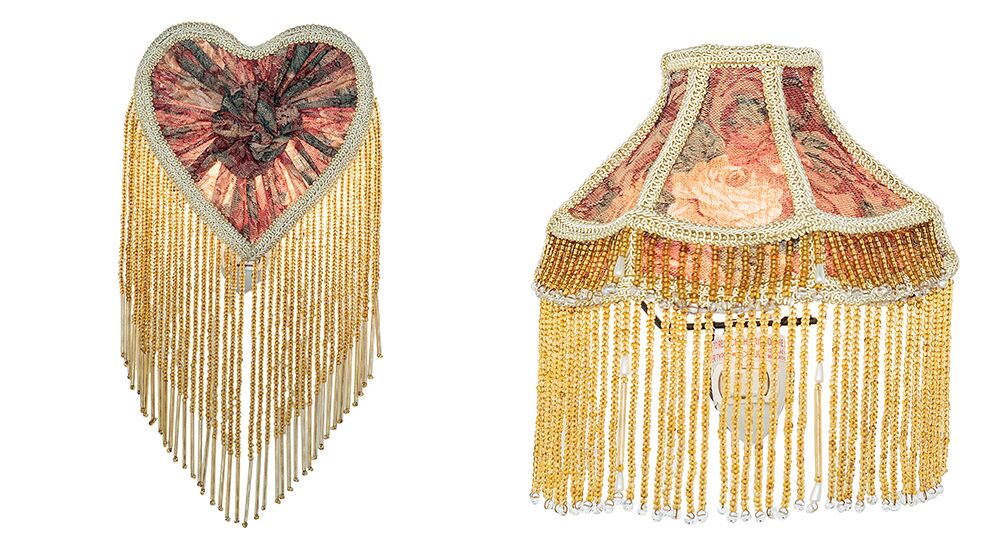 An alluring and beautiful set of night lights. One night light features a heart-shaped floral brocade fabric and a dome-shaped floral brocade fabric night light. Both are edged in long glass beaded trim. The night lights are ideal for illuminating kitchens and baths and were inspired by beautiful fabrics and fashion from New York to Chicago; Illinois; and Los Angeles; California. The Fabric & Fringe Night Light Set is featured in our American-designed; handcrafted Fabric & Fringe Collection. UL and cUL are listed for dry locations.