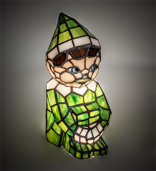Warm your heart and imagine Santa's Helper on your shelf or over the mantle. A charming lighted Tiffany styled sculpture; Santa's Helper comes to light as a colorful accent lamp. The Elf is adorned in an exquisite outfit featured in Green art glass with White glass trim. Facial features include Blue glass eyes and other complementary attributes. Handcrafted of individual pieces of stained glass using the famous Meyda Tiffany copperfoil construction process. UL and cUL listed for dry and damp locations.