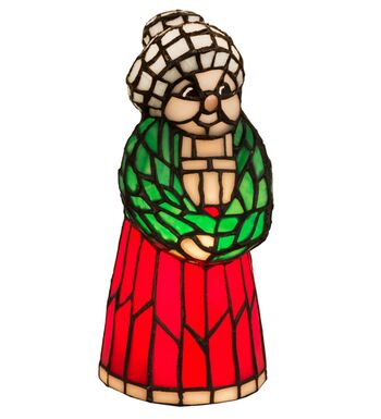 Tis the season to display a wonderful decorative accent lamp designed as the wife of the greatest gift give of all time. The always warm and charming Mrs. Santa Claus is designed in a Christmas Red skirt with a Holiday Tree Green Shawl handcrafted of individual pieces of stained glass using Tiffany's famous copperfoil construction process. Warm your heart and holiday spirit with Mrs. Claus on tabletops; countertops and mantels