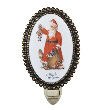 Tis the season with this charming night light featuring a Santa Claus fused glass design. The colorful Red outfitted Santa is featured with an Elf Holding Toys on a White Glass cameo lens with an Antique Brass oval-shaped; beaded frame. This miniature wall fixture is ideal for illuminating bathrooms and kitchens in various American towns and villages; from Christmas Cove; Maine; to Bethlehem; Pennsylvania; to Noel; Missouri. This collectible is a limited edition piece signed and numbered by Meyda artisans. The Christmas Fruits of His Labor Fused Oval Night Light is included in our American-designed; handcrafted Holiday Collection. UL and cUL listed for dry locations.