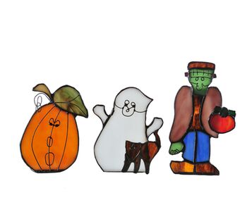 Add a festive spirit to your home during the October holiday with our adorable Halloween Tea Lights. Colorful stained glass home accents for Halloween and throughout the Autumn Season. These lighted figures depict a Friendly Pumpkin; a White Ghost with Black Cat; and Frankenstein. These three figures are handcrafted using the famous Meyda Tiffany copperfoil construction process. Ideal as illuminating accent pieces on mantels; credenzas; occasional tables; and other spaces throughout the US in residential and hospitality settings; from Salem; Massachusetts; to Sleepy Hollow; New York; to Transylvania; Romania. The 4.75" High Halloween 3 Pieces Tea Light Set is included in our American-designed; handcrafted Halloween Collection. UL and cUL listed for dry locations.