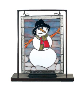 A Winter White snowman dressed in Black top hat and Red and Green striped scarf is ready to warm your home. Made of 79 pieces of hand cut stained glass; and handcrafted utilizing the copperfoil construction process; this mini window is encased in a solid brass frame and hangs perfectly in it's own brass tabletop display.